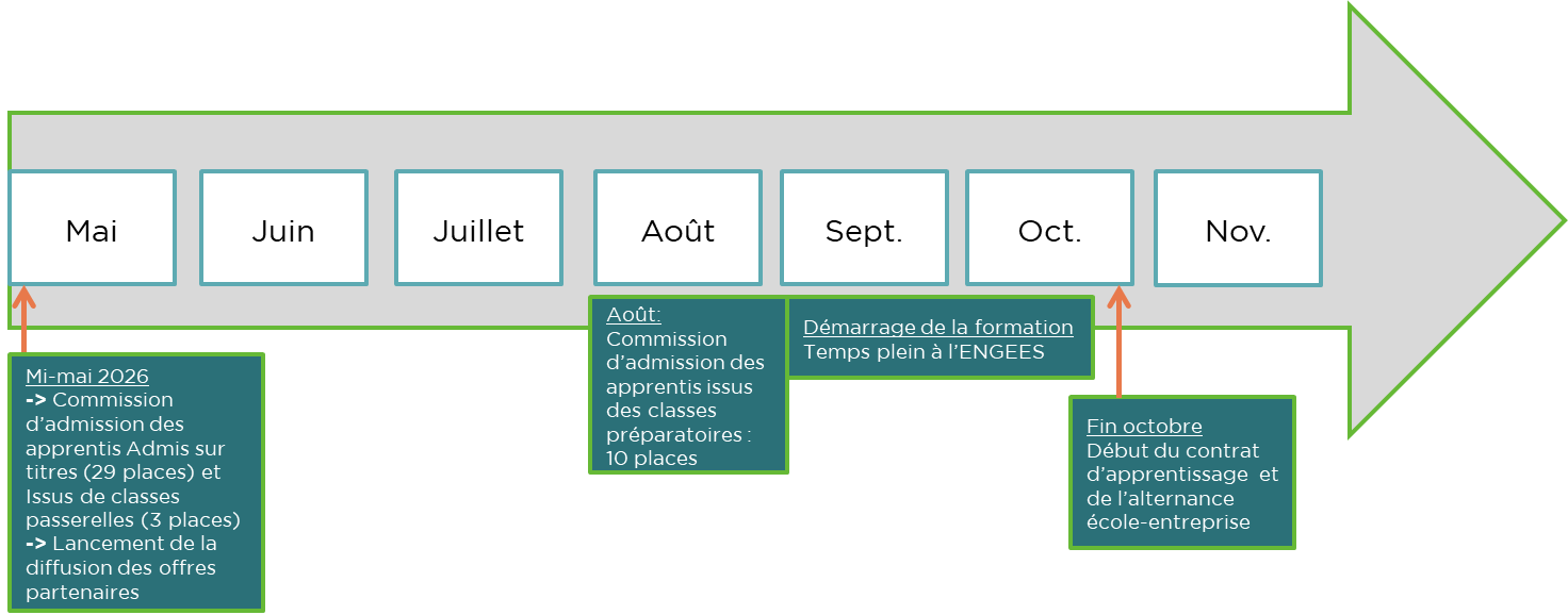L'ENGEES propose depuis 2009 une formation d'ingénieur par la voie de l'apprentissage, en partenariat avec le CFA de la CCI CAMPUS ALSACE.